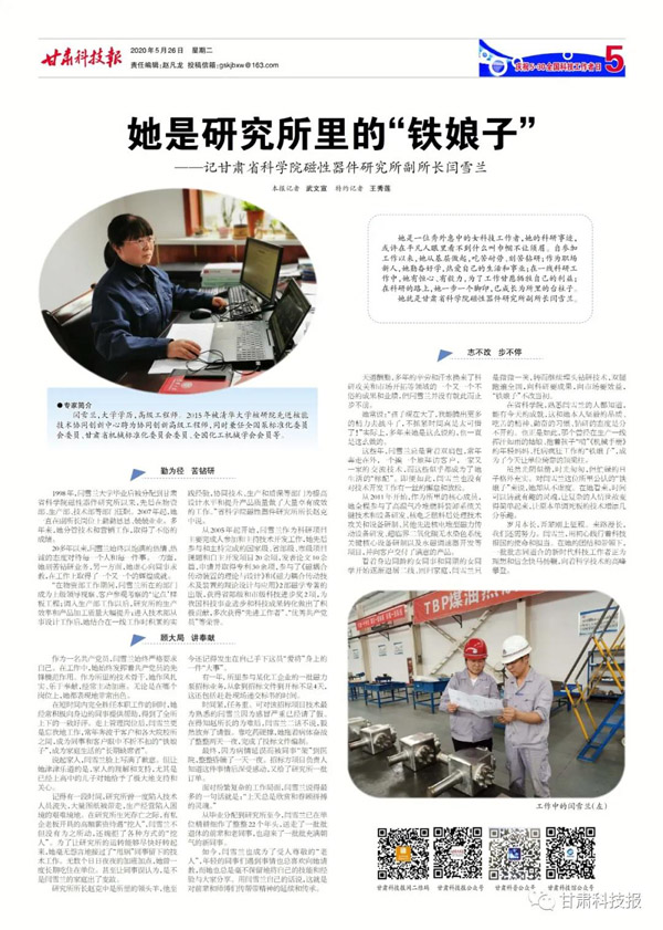 1998年,閆雪蘭大學畢業后被分配到甘肅省科學院磁性器件研究所以來,先后在物資部、生產部、技術部等部門任職。2007年起,她一直在副所長崗位上勤勤懇懇、兢兢業業。多年來,她分管技術和營銷工作,取得了不俗的成績。20多年以來,閆雪蘭始終以飽滿的熱情、熱誠的態度對待每一個人和每一件事。一方面,她刻苦鉆研業務,另一方面,她虛心向同事求教,在工作上取得了一個又一個的輝煌成就。“在物資部工作期間,閆雪蘭所在的部門成為上級領導視察、客戶參觀考察的‘定點’樣板工程;調入生產部工作以后,研究所的生產效率和產品加工質量大幅提升;進入技術部從事設計工作后,她結合在一線工作時積累的實踐經驗,協同技術、生產和質保等部門為提高設計水平和提升產品質量做了大量卓有成效的工作。”省科學院磁性器件研究所所長趙克中說。從2005年起開始,閆雪蘭作為科研項目主要完成人參加和主持技術開發工作,她先后參與和主持完成的國家級、省部級、市級項目課題和自主開發項目20余項,發表論文10余篇,申請并取得專利30余項,參與了《磁耦合傳動裝置的理論與設計》和《磁力耦合傳動技術及裝置的理論設計與應用》2部磁學專著的出版,獲得省部級和市級科技進步獎2項,為我國科技事業進步和科技成果轉化做出了積極貢獻,多次獲得“先進工作者”、“優秀共產黨員”等榮譽。